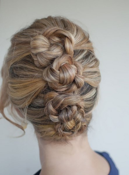 Классическое русское на основе трёх прядей, позиционируемое в разных видах- от одиночной косы на затылке до сложных комбинаций из 2 и более кос, уложенных по-разному.
