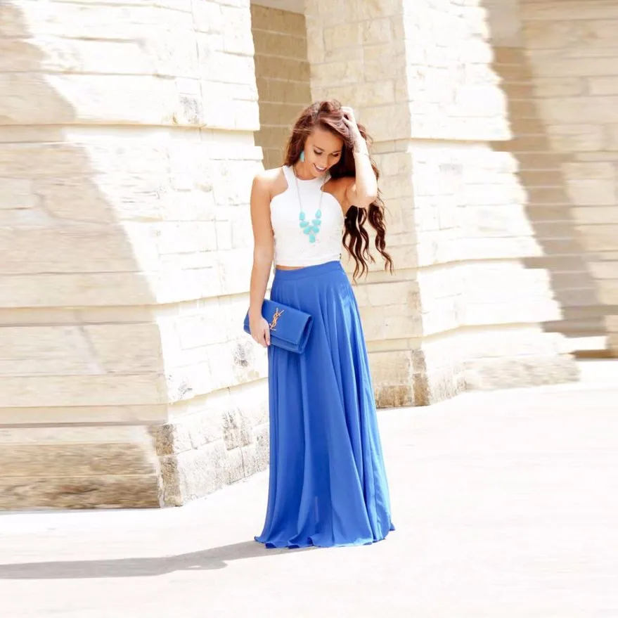 С этим руководством легко узнать, как носить темно-синие макси-юбки!