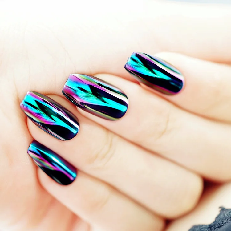 Для создания зеркальных ногтей мастер по маникюру использовал порошок под названием хромовый порошок. Порошок состоит из небольших металлических стружек с оксидным покрытием, поэтому он будет иметь блестящий, переливающийся цветовой слой. Кроме того, эта пудра также обладает способностью прилипать к поверхности ногтя, создавая привлекательный, неповторимый зеркальный эффект.