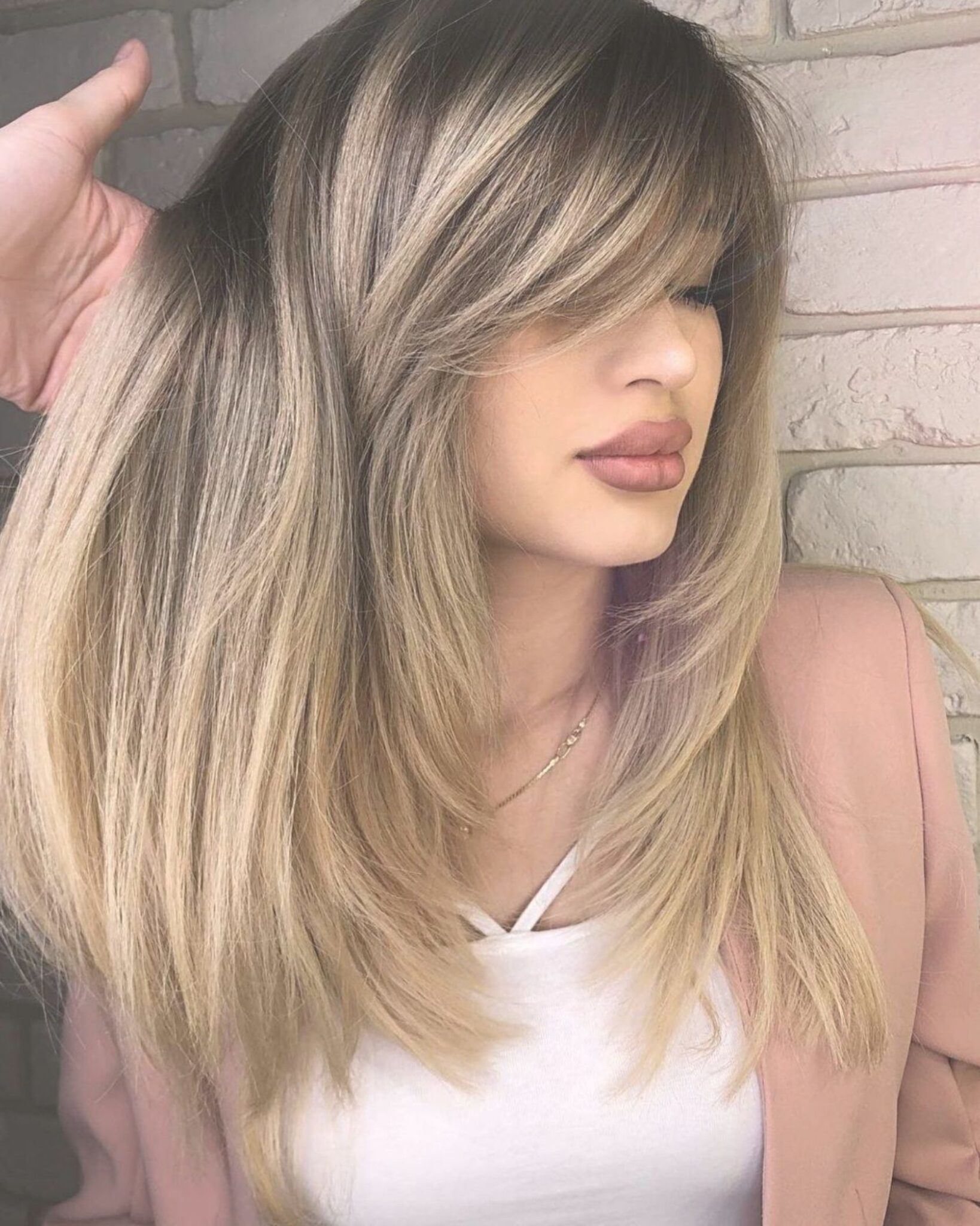 Наша следующая идея — многослойная светлая прическа. Волосы имеют более короткие слои спереди, что создает длинную бахрому.