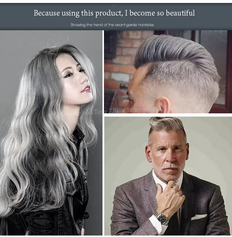 Таким образом, вы можете мгновенно переключиться на седой цвет волос с эффектной стрижкой и многогранной мерцающей перманентной краской для волос.